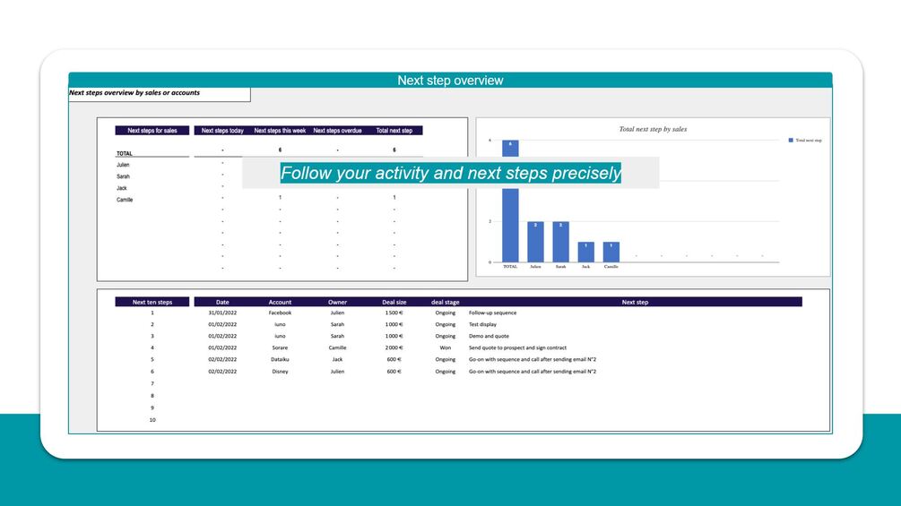 3 sheets to help you follow and manage your activity, next steps, accounts