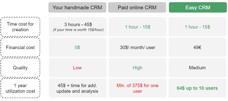 Instead of taking 3 hours of your time to create a handmade solution, that will show its limits quickly as you grow bigger, instead of paying +30$/ month for basic features of an online CRM, buy this CRM for less than 50€ and enjoy a ready to use tool that will bring value to your prospection activity as you start